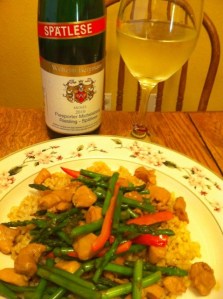 October is a great time to celebrate all things German, so this edition of “Monday Wines” is dedicated to Riesling.  Too often, it gets poo-pooed for being too sweet, but, if that is your reaction, you have probably not given it a fair shake.  I prefer Kabinett Trocken, in general, but sometimes a little sweetness is just what you need. You won’t find a much better pairing for Thai and other Asian cuisine, especially if it has some heat.  The crisp, sweet Willhelm Bergmann Piesporter Spatlese was a perfect foil for this chicken and vegetable stir-fry.  It really complimented the garlic and soy flavors without overpowering the food.