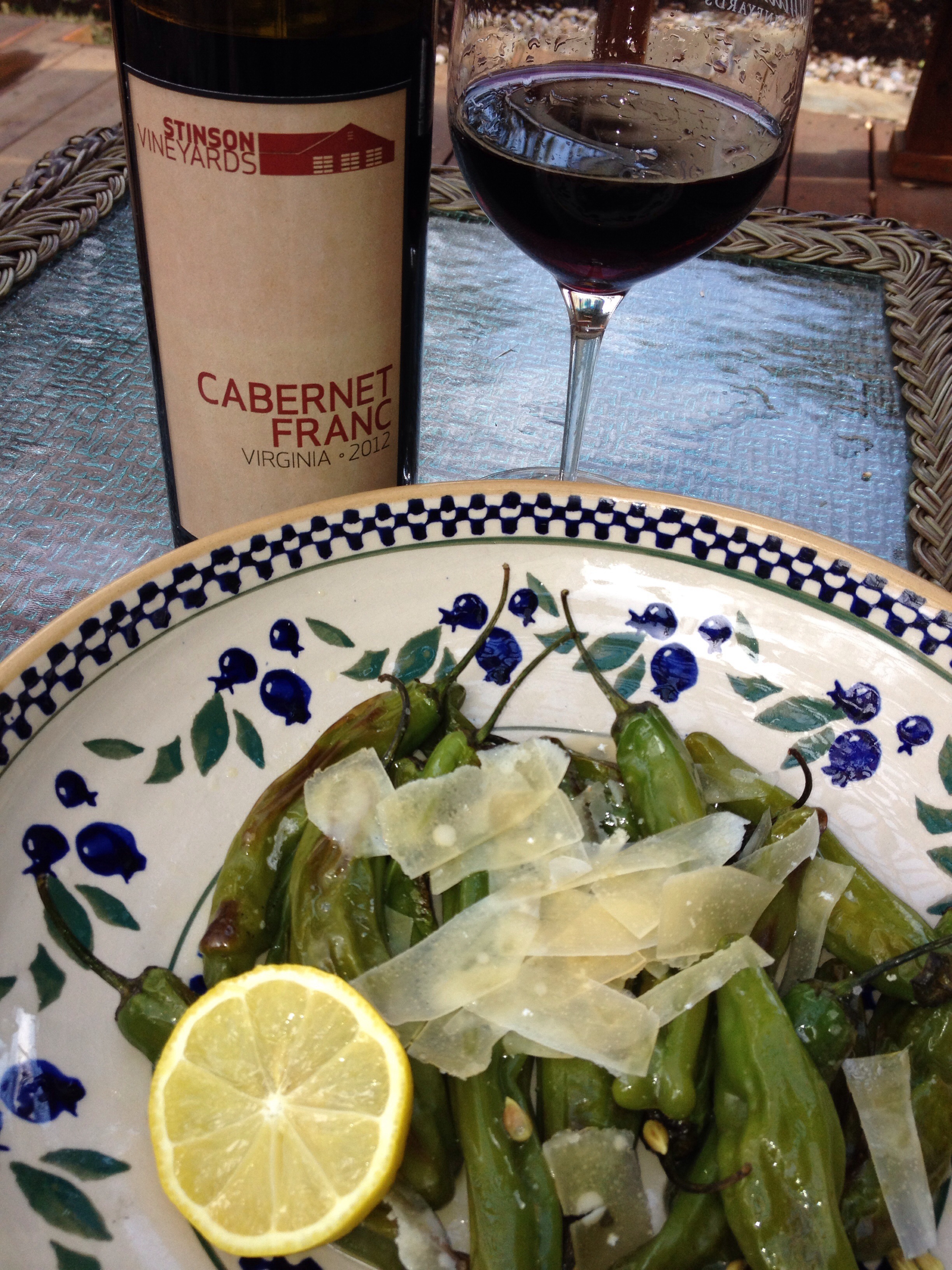 Without a kitchen, my options are limited for pairing fare, but thanks to a borrowed toaster oven, I pulled off something. The first one I opened was the 2012 Cabernet Franc. When I think Cab Franc, I think green pepper, so I roasted some Shishito peppers. It is one of my current favorite appetizers. Toss them in olive oil and broil them until they blister. Shave some parmesan cheese and sprinkle with salt and a squeeze (or three) or lemon.