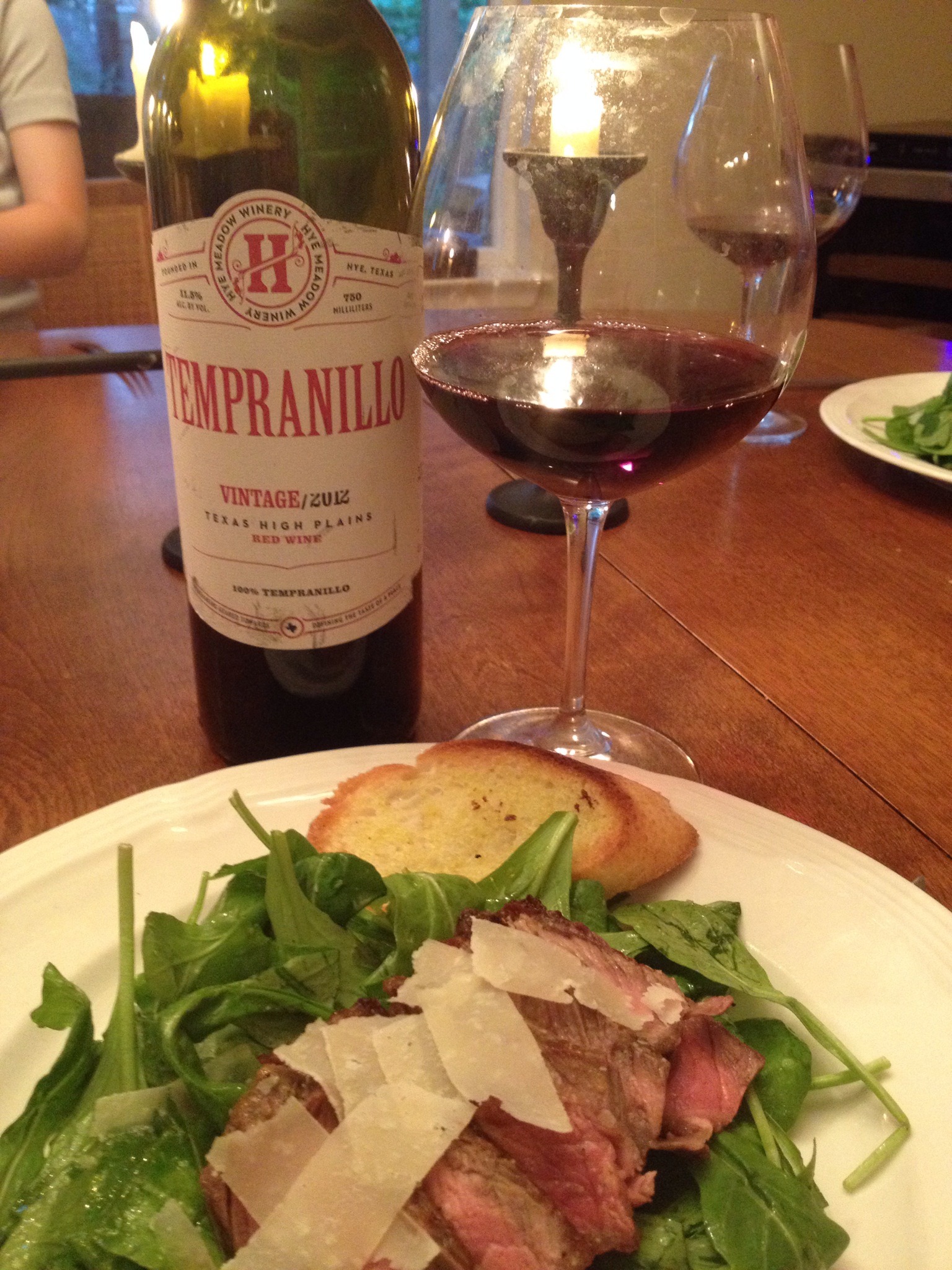 On Saturday, we decided to stay with the Hye (Hye Meadow Winery, that is) and opened the Tempranillo. We loved this wine. Great classic cherry-cola notes, the spice and acid I’ve come to expect from a lot of Texas wines. Since the weather was screaming “summer” we complied. We started with bruschetta with tomato and basil and made NY Strips on the grill, sliced them thin over arugula with lemon and Parmesan. Simple and tasty every time. It paired perfectly.