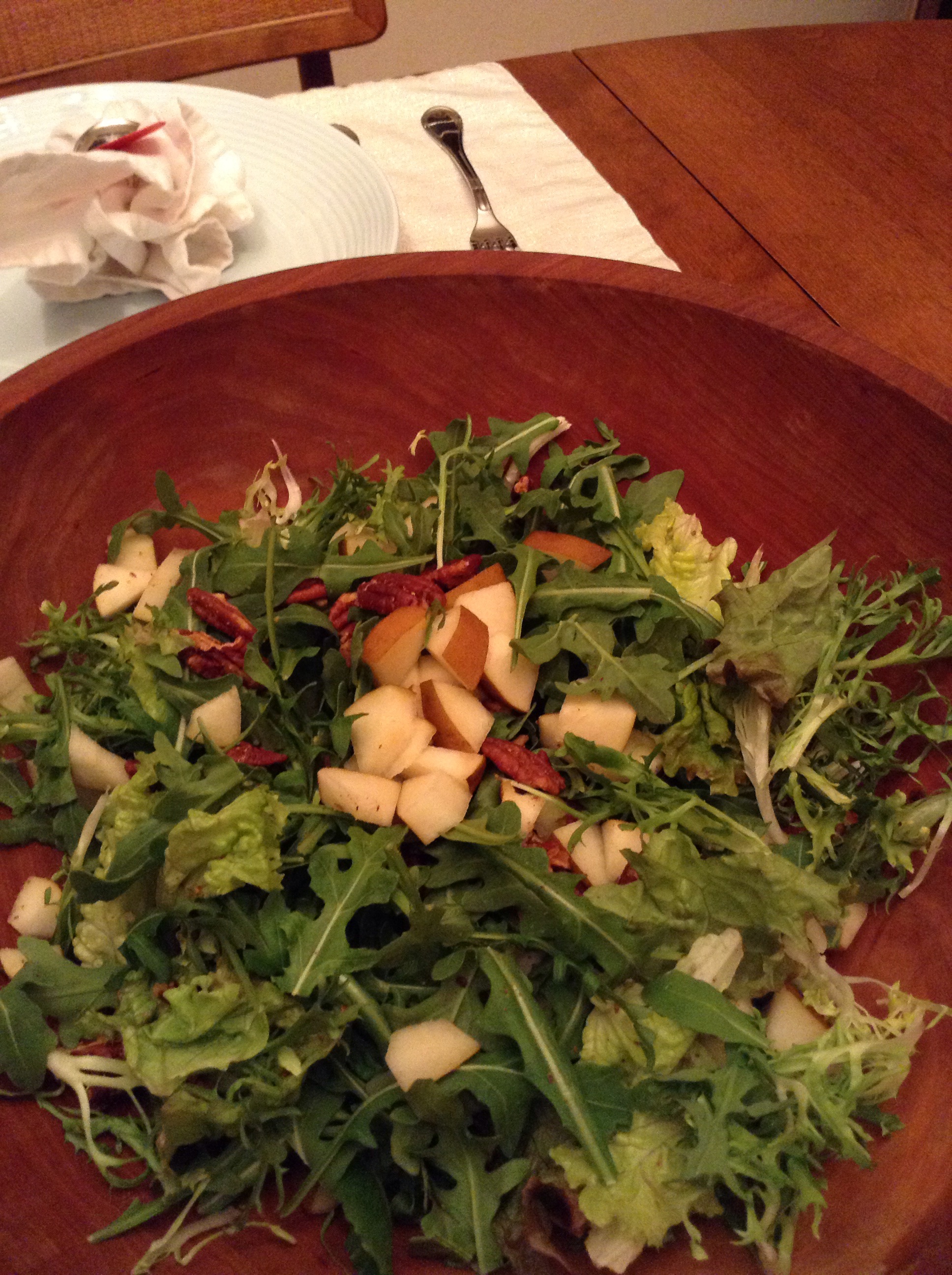 A change of scene often requires other adjustments. To counter the sauce, I changed the salad to frisee, arugula, and pear with pecans and a fig dressing. The sweetness of the fig and spice of the greens were great with the wine as well. I added some Balsamic vinegar to the potatoes to give them a glaze.