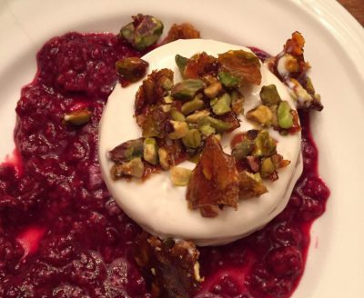 Rosewater Panna Cotta on Raspberry compote with Pistachio brittle.