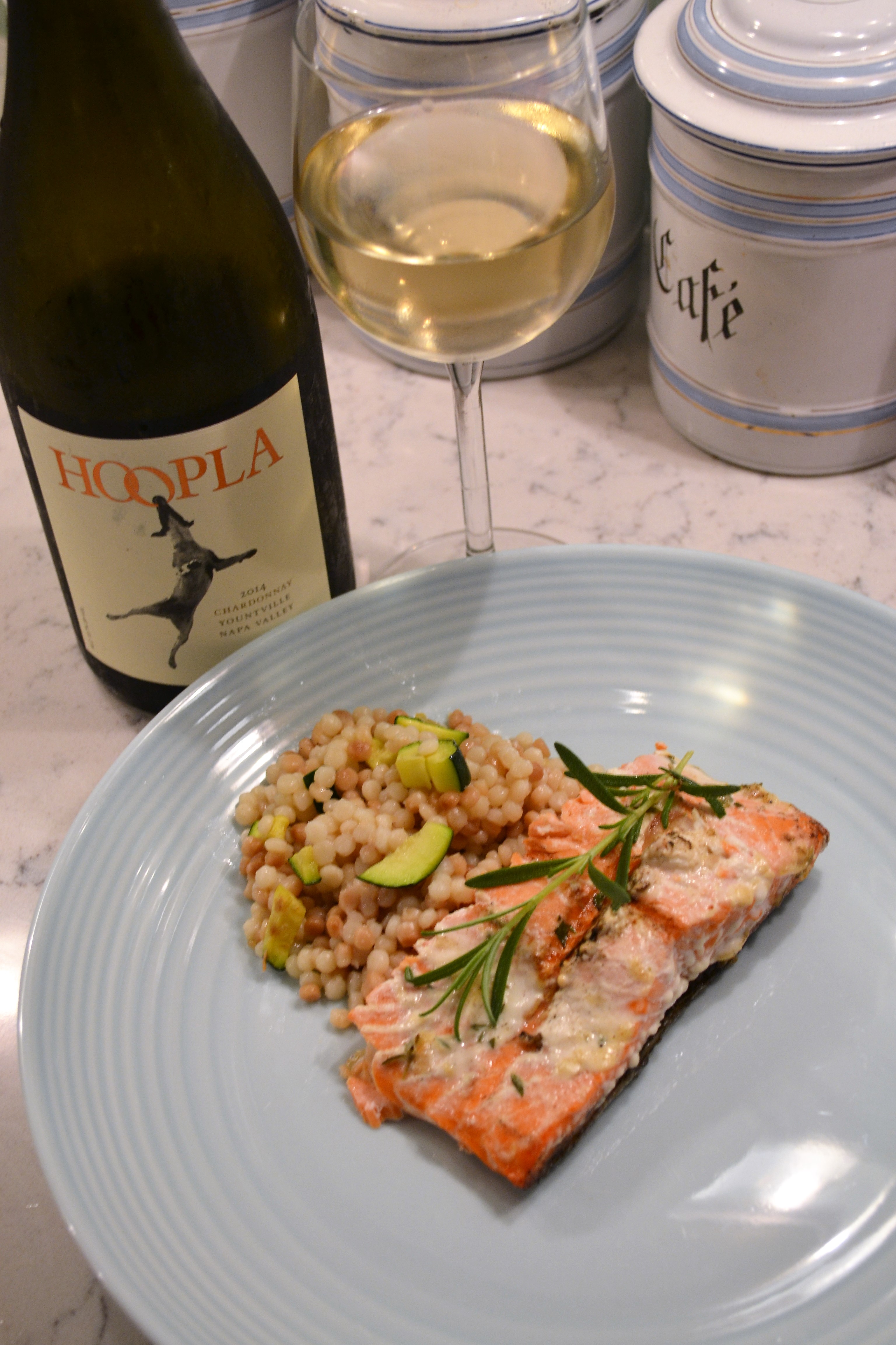 I paired it with salmon which I coated with sautéed shallots, mayonnaise, Dijon, lemon juice and herbs before grilling. A green salad and a side of Israeli couscous with sautéed shallot and zucchini rounded out the meal.
