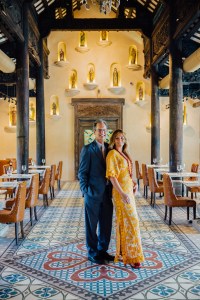 We began in the main dining area. The structure is a repurposed 200-year-old town hall from North Vietnam. Saints placed just below the trellis over look the custom encaustic lie. An array of sitting areas placed around the venue invite relaxation nd conversation. Colorful tiles highlight alcoves and separate spaces. It is stunning.