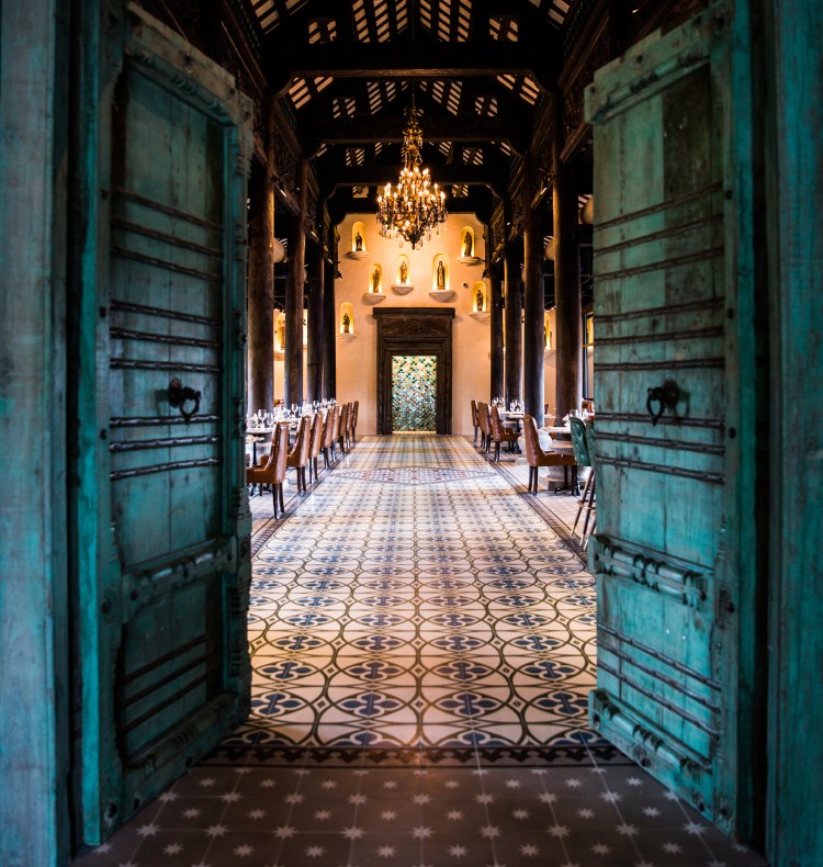 We began in the main dining area. The structure is a repurposed 200-year-old town hall from North Vietnam. Saints placed just below the trellis over look the custom encaustic lie. An array of sitting areas placed around the venue invite relaxation nd conversation. Colorful tiles highlight alcoves and separate spaces. It is stunning.