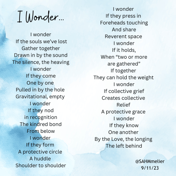 22 years ago, I lost one of my dearest friends in the Twin Towers. In 2022, we said goodbye to my mother-in-law, her birthday was on 9/11. In 2023, I lost the man I was dating through my 20s, a relationship which ended for good in September of 2001. Six weeks later, my greatest loss to date, my father. At his funeral, my friend said he thought our fathers would have been friends. He, too, lost his dad on 9/11. That conversation inspired this poem. I choose to believe this to be the case. I choose to feel the collective grace in my hardest moments. #grief #september11 #loss